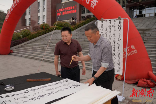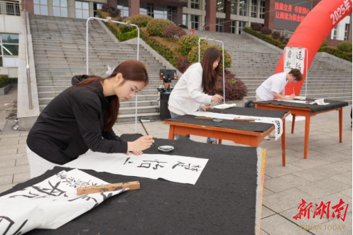 师生在“廉洁诗词书法展”区域创作并打卡留念