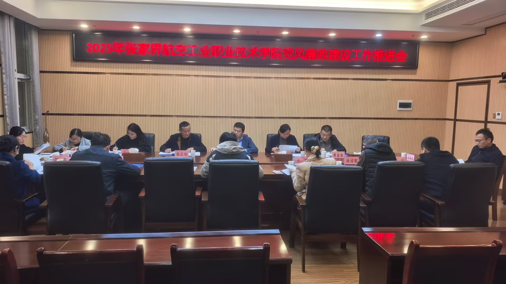 2025年11月12日下午,学校在图书馆二楼第一会议室召开党风廉政建设工作推进会。会议由纪委书记於燃原主持,相关职能部门主要负责人和纪检监察处全体人员参加。