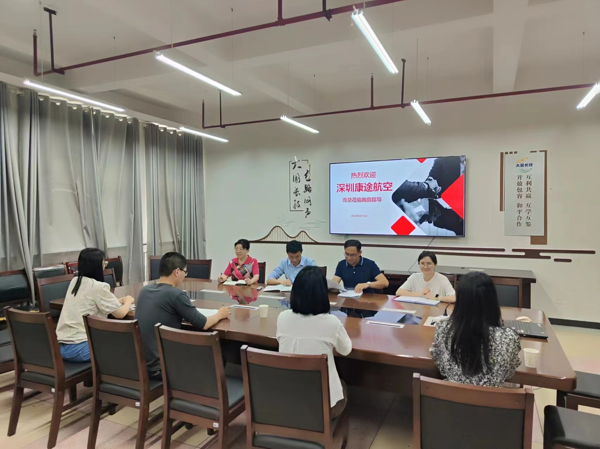 5月14日,航空管理学院院长姬海华、党总支书记黄勇、党总支副书记龚素霞和学院教研室主任在图书馆606会议室与九江聚思味食品有限公司、深圳市康途航空旅游有限公司、深圳市瑞航物流有限公司开展访企拓岗调研。