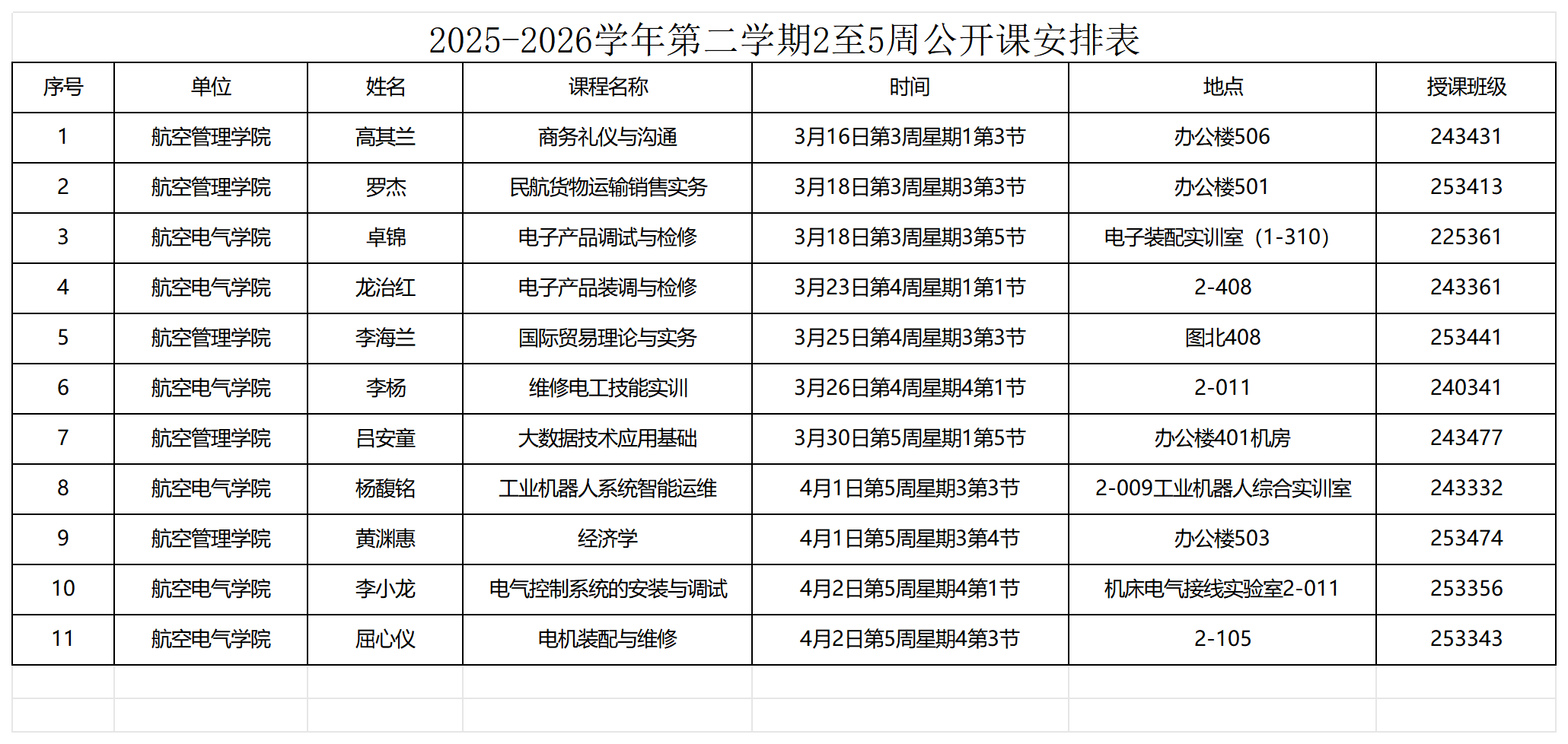 2025-2026学年第二学期2至5周公开课安排表