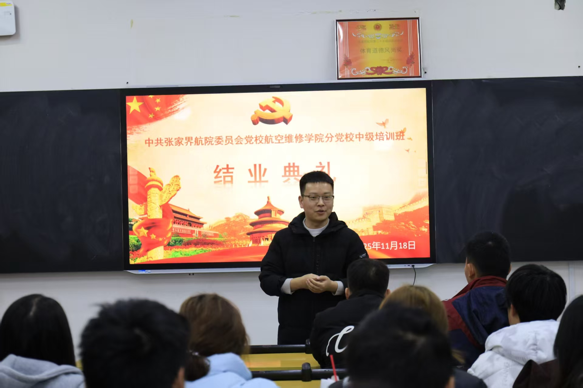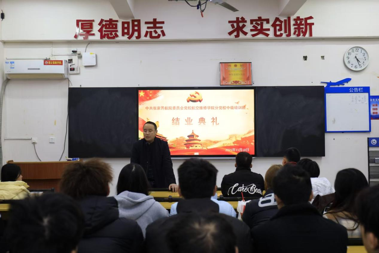 随后,学院党总支书记谭本军在总结讲话中指出,本次中级党校培训紧扣新时代党的建设总要求,通过专题授课、个人自学、微视频制作、实践教学、结业考试等多元形式,系统开展党的创新理论、党史党章、航空报国精神等内容教学,有效提升了学员的政治判断力、政治领悟力、政治执行力。他对全体学员提出三点要求:一要坚定理想信念,始终牢记“为党育人、为国育才”使命,把个人追求融入国家航空事业发展;二要锤炼过硬本领,立足飞机机电设备维修等专业特色,将理论知识转化为维修实操能力,争当行业技术骨干;三要勇于担当作为,在校园建设、专业学习、志愿服务中发挥先锋模范作用,以实际行动践行“请党放心,强国有我”的青春誓言。