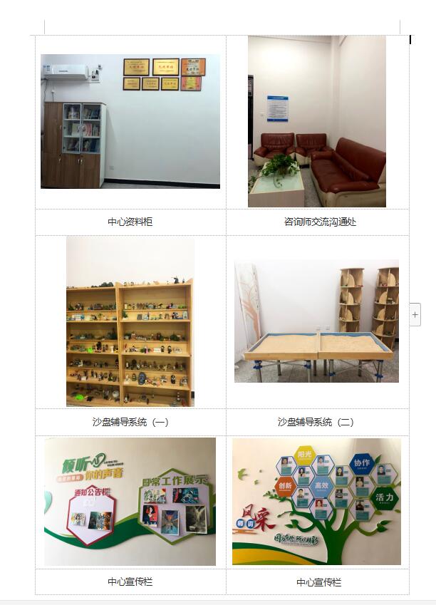 心理健康教育与咨询中心配置了咨询室、沙盘室、宣泄室、接待室、团体辅导室等功能室,环境优雅,整洁舒适。中心还配备了专业的心理测评软件、心理档案管理系统,以及沙盘、放松椅等心理辅导设备,为我校心理健康教育与咨询工作的顺利开展提供了有力支持。